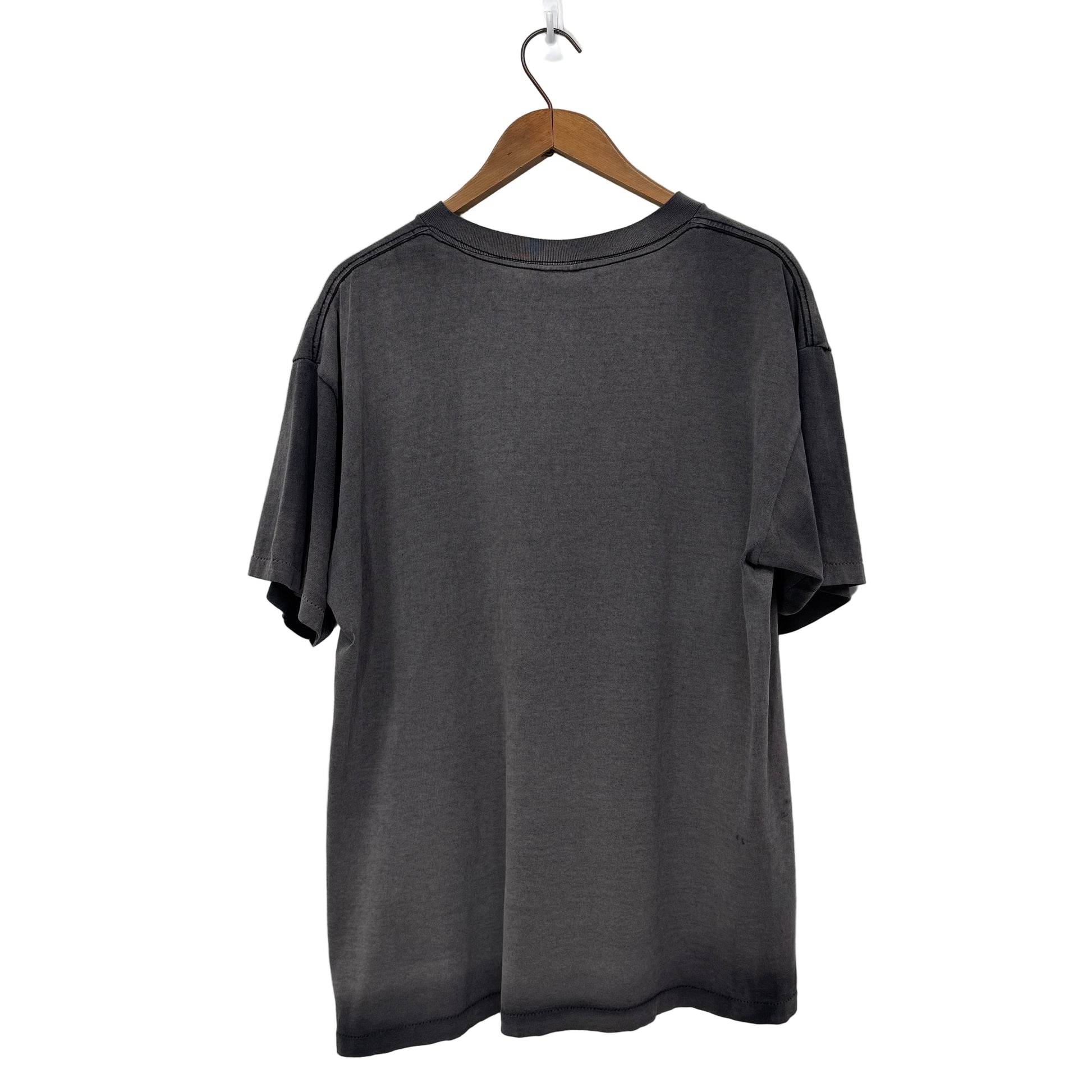 Tag size XL and it is a loose fit. Made in the USA in the 90's of 100% cotton and it is a single stitch.